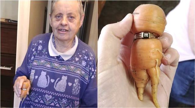 Gần 13 năm sau, cách đây vài tuần, khi con dâu bà đang thu hoạch cà rốt trong vườn, cô để ý thấy có một củ cà rốt thân hình vẹo vọ như thể một tay mập ú đang bị một chiếc nhẫn thít chặt. Quan sát kỹ, cô thấy rằng hóa ra củ cà rốt đó quả thực đang đeo một chiếc nhẫn kim cương.