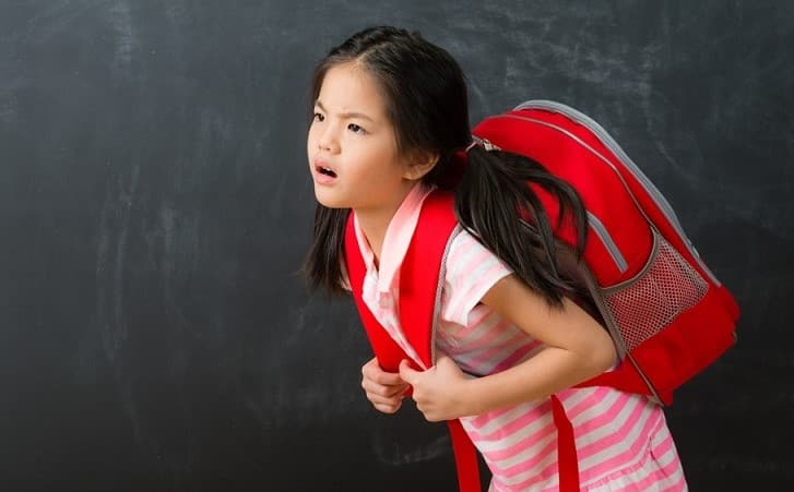 Nếu trọng lượng cặp sách quá nặng, cơ thể của trẻ dễ bị mất thăng bằng, ngửa ra sau té ngã. Cột sống bị áp lực liên tục khiến trẻ bị đau vai, cổ và lưng. Theo Kid’s Health, các chuyên gia sức khỏe khuyên rằng trẻ em không nên mang cặp sách nặng quá 10-15% trọng lượng cơ thể. Dấu hiệu dễ thấy nhất khi con đang phải mang cặp sách quá sức là dáng đi xấu, xiêu vẹo, gù lưng, trên vai trẻ có vết xước do quai cặp đè vào liên tục… Trường hợp xấu hơn là con sẽ bị vẹo cột sống.
