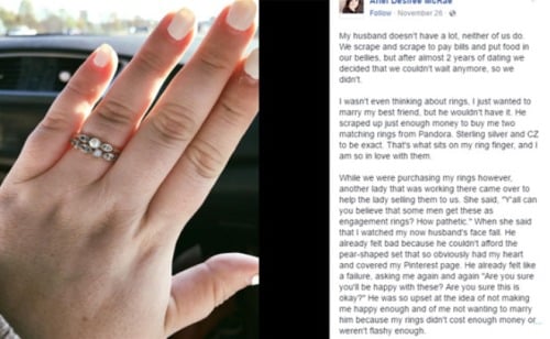 Do anh Quinn (lúc đó 22 tuổi) chỉ là một nhân viên tư vấn bảo trì xe hơi còn cô Ariel đang học Đại học Tennessee. Hiện thu nhập của hai người không nhiều, vì vậy họ luôn rất tiết kiệm. Họ đã chọn một chiếc nhẫn bạc đính đá đơn giản có giá 130 đô ở cửa hàng Pandora. Cô Ariel cảm thấy rất mãn nguyện khi nhìn thấy chiếc nhẫn, nhưng khi cô đeo thử thì lại nghe thấy người nhân viên đứng bên cạnh cười nhạo: “Bạn có thể tưởng tượng lại có người mua cái này làm nhẫn đính hôn không? Thật đáng thương!”