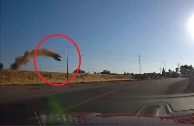 Sự việc này xảy ra vào ngày 14/7 tại thành phố Yuba thuộc bang California. Khi đó, có một chiếc xe ô tô bốc khói trắng đã bật ra khỏi đường quốc lộ 99, sau khi bay một đoạn trên không trung thì rơi xuống đường bên kia, đầu xe đập xuống mặt đường rồi tiếp tục lăn hai vòng rồi nằm ngửa trên đường.