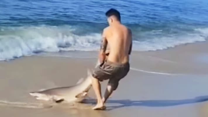Video người đàn ông tay không vật lộn với cá mập trên bãi biển
