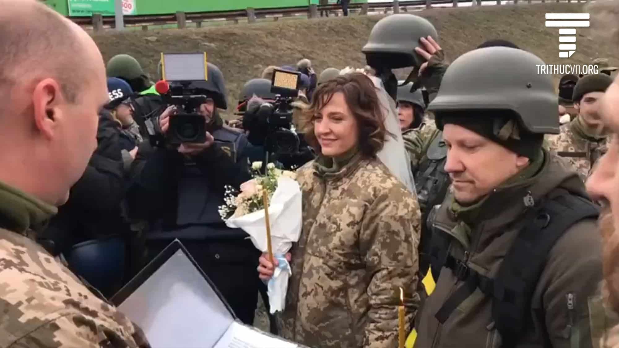 Trong đoạn video được chia sẻ trên mạng xã hội hôm 6/3, cô dâu Lesya và chú rể Valeriy vô cùng hạnh phúc trong lễ cưới đặc biệt của họ gần thủ đô Kiev. Cả hai đều là thành viên đội bảo vệ lãnh thổ Ukraine, và trong ngày đặc biệt này, họ vẫn khoác lên mình bộ quân phục. Xung quanh cô dâu, chú rể là những người đồng đội đang chúc phúc cho ngày vui của họ.