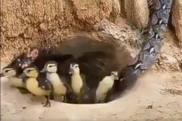 Trong đoạn clip, một con vịt mẹ và đàn vịt con đang ở trong một cái hố thì có một con rắn trườn vào chuẩn bị tóm gọn cả ổ vịt. Vịt mẹ cảm nhận được nguy hiểm đến gần nên đã kêu to và vỗ cánh liên tục để xua đàn vịt con chạy ra khỏi hố nhằm bảo vệ chúng. Thế nhưng bất hạnh thay, vịt mẹ đã bị con rắn quấn lấy và trở thành bữa ăn của nó.