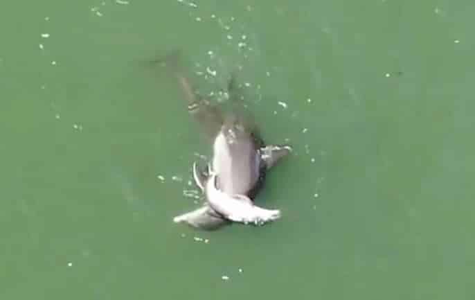 Trước đây không lâu, ông McCarthy còn dùng flycam quay được hình ảnh đáng yêu khi một con cá heo con mới sinh ngắm nhìn cá heo mẹ bơi lên bơi xuống để đuổi theo con mồi.