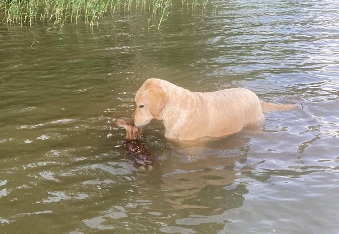 Vào sáng ngày 2/6, ông Ralph Dorn (62 tuổi) đang tìm kiếm chú chó cưng Harley 6 tuổi thuộc giống Goldendoodle của mình ở bên hồ sau nhà thì nhìn thấy nó đang bơi dưới hồ và bên cạnh còn có một chú nai con. Thì ra là nó đang cứu con nai lên bờ.