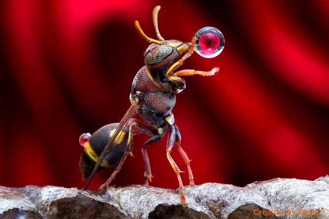 Một con ong trông như là đang chơi đùa với một giọt nước. Thực ra nó đang hút nước thừa từ trong tổ và hất đi