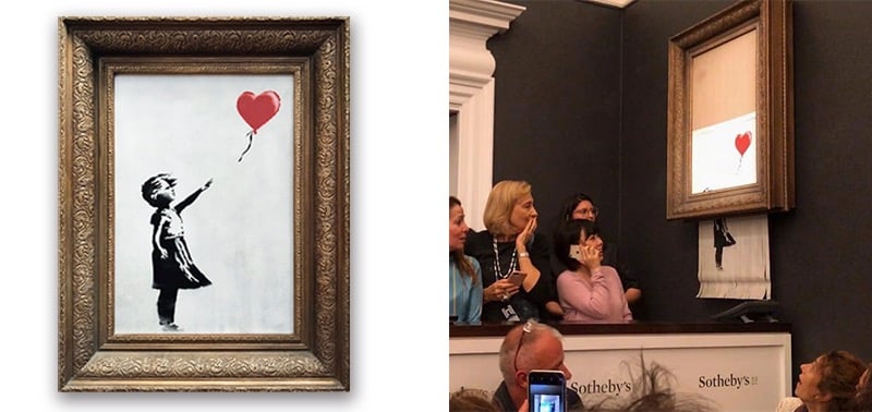 Một bức tranh được đóng khung mang tên ‘Cô bé với Bóng bay’ của họa sĩ Banksy được đem ra đấu giá tại nhà đấu Sothebys ở London. Khi buổi đấu kết thúc với giá cuối cùng là 860.000 bảng Anh (khoảng hơn 1,1 triệu đôla) và chủ tọa gõ búa chốt bán, khung tranh bỗng vang lên tiếng bíp. Và rồi, rẹt rẹt. Chỉ vài giây sau, bức tranh trượt qua đáy của khung, và gần như bị cắt thành từng mảnh nhỏ trước con mắt kinh ngạc của người xem.