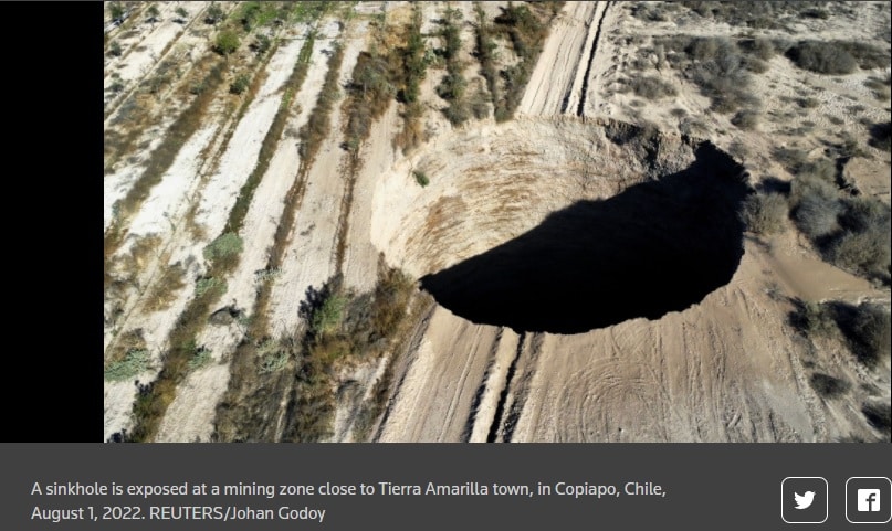 Huge sinkhole of 25 meters in diameter, appears in an area of Tierra Amarilla, #Atacama, #Chile. (01.08.2022). pic.twitter.com/EbM7RBn5yd