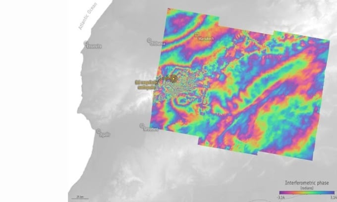 Kết quả đo từ vệ tinh hé lộ mức độ xê dịch của mặt đất gây ra bởi trận động đất 6,8 độ ở Morocco tuần trước khiến gần 3.000 người thiệt mạng. Trận động đất xảy ra ở vùng nông thôn trên dãy núi Atlas cách thành phố Marrakech khoảng 75 km vào tối hôm 8/9. Theo Cơ quan Vũ trụ châu Âu (ESA), khu vực này nằm ở ranh giới giữa hai mảng kiến tạo châu Âu và châu Phi, dẫn đến khu vực dễ bị ảnh hưởng bởi động đất.
