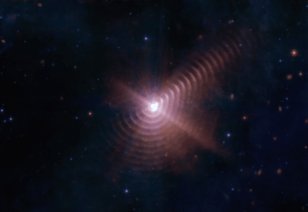 Hình ảnh mới thu được từ kính thiên văn James Webb của NASA (Cơ quan Hàng không Vũ trụ Mỹ) cho thấy hiệu ứng ánh sáng cực mạnh từ một ngôi sao đang giải phóng vật chất cách xa 5.600 năm ánh sáng.