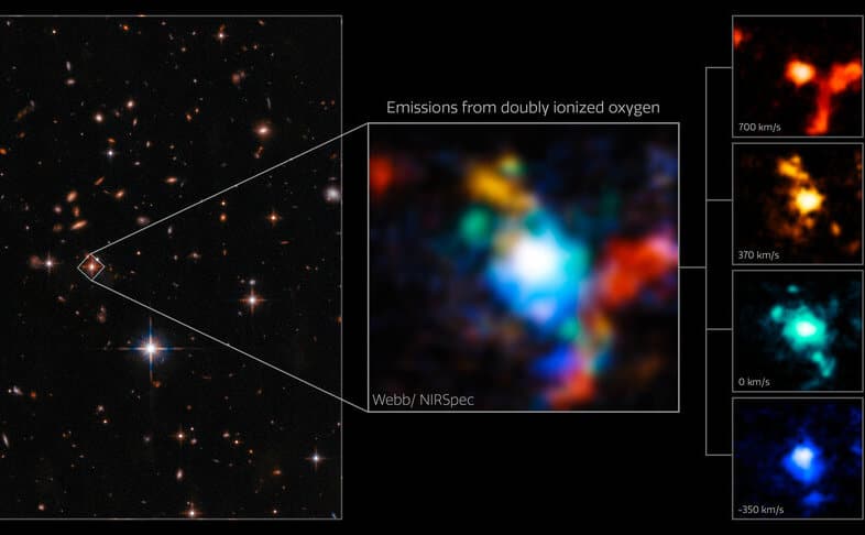Nhóm nghiên cứu đã dùng quang phổ cận hồng ngoại trên kính viễn vọng Webb để nghiên cứu sự vận động của khí, bụi và vật chất trong thiên hà. Máy quang phổ hồng ngoại trên kính viễn vọng Webb có thể đồng thời thu thập quang phổ trong toàn thị trường của kính viễn vọng (thay vì thu thập lần lượt từng điểm một), rất quan trọng đối với việc lý giải sự vận động của vật chất xung quanh chuẩn tinh. Bởi vì sự vận động của khí xung quanh chuẩn tinh có thể làm quang phổ dịch chuyển đỏ hoặc dịch chuyển xanh, đội nghiên cứu thông qua quan sát sự thay đổi tần số của quang phổ ion oxi để xác định chuyển động của vật chất xung quanh thiên hà.