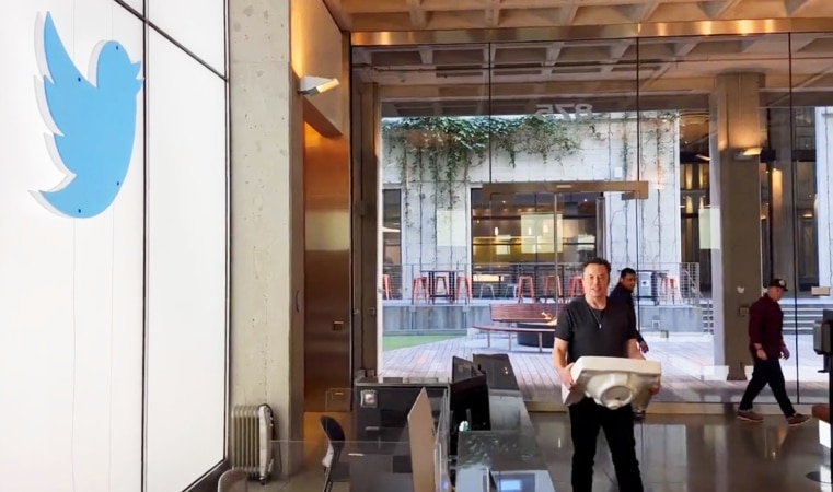 Trong video, người ta thấy ông đang bê một thứ trông giống như bồn rửa mặt trên tay và bước vào tòa nhà văn phòng của Twitter.