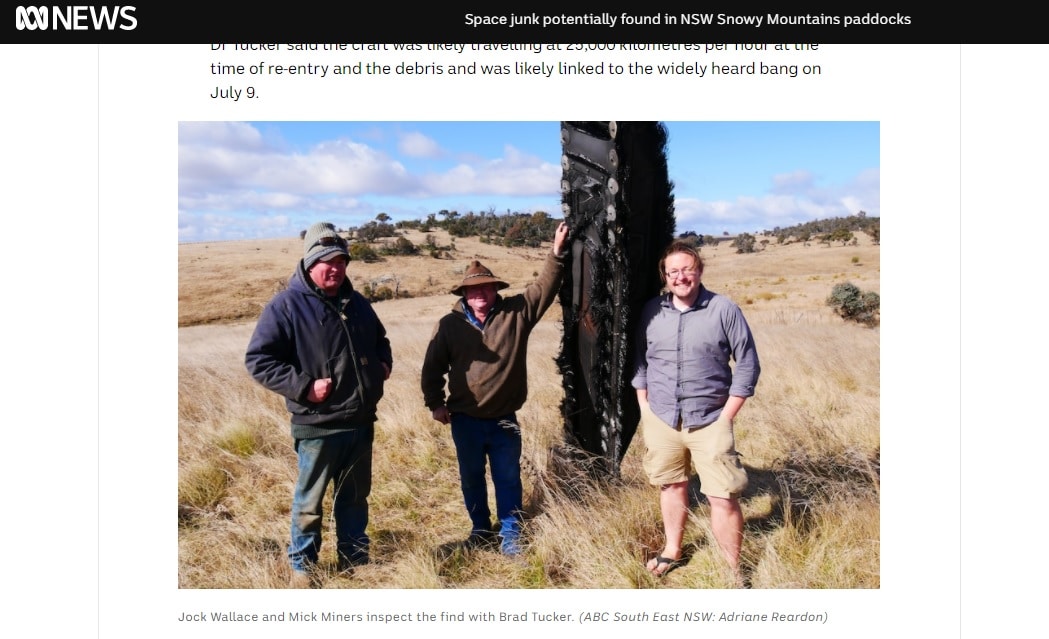 Nông dân chăn cừu Mick Miners tìm thấy vật thể cao 3 m trên cánh đồng hôm 25/7 và không biết đó là gì. Sau khi gọi điện cho hàng xóm Jock Wallace, Miners phát hiện Wallace từng bắt gặp nhiều mảnh vỡ khác ở khu đất của anh hôm 21/7. Wallace thông báo cho cơ quan hàng không dân sự địa phương và họ khuyên anh liên lạc với NASA (Cơ quan Hàng không Vũ trụ Mỹ) để tìm hiểu thêm thông tin.