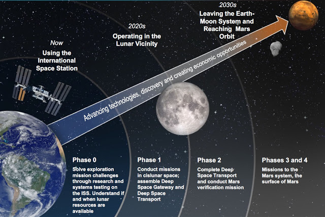 NASA cho biết, hiện họ đang tiến hành những bước đi đầu tiên trong giai đoạn 0, tiến hành các thử nghiệm trên trạm không gian quốc tế ISS và phát triển quan hệ hợp tác với các công ty tư nhân như SpaceX, Boeing, Orbital ATK, cho phép các hãng này tham gia khai thác.