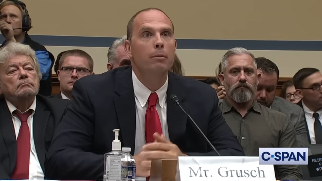 Vào cuối năm 2023, sĩ quan tình báo chuyên nghiệp David Grusch tuyên bố rằng Chính phủ Mỹ đã che giấu chương trình nghiên cứu UAP/UFO, nhưng Chính phủ Mỹ đã nhiều lần phủ nhận tuyên bố đó. (Ảnh chụp màn hình C-SPAN)
