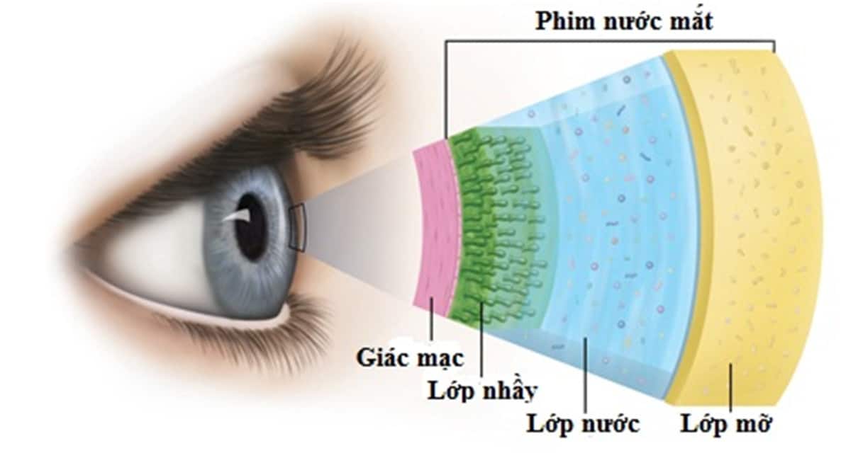 Ở ngoài cùng của con mắt là màng phim nước mắt. Màng này che phủ mặt trước giác mạc, có chiều dày khoảng 7µm, từ ngoài vào trong có 3 lớp, gồm lớp mỡ, lớp nước và lớp nhầy.