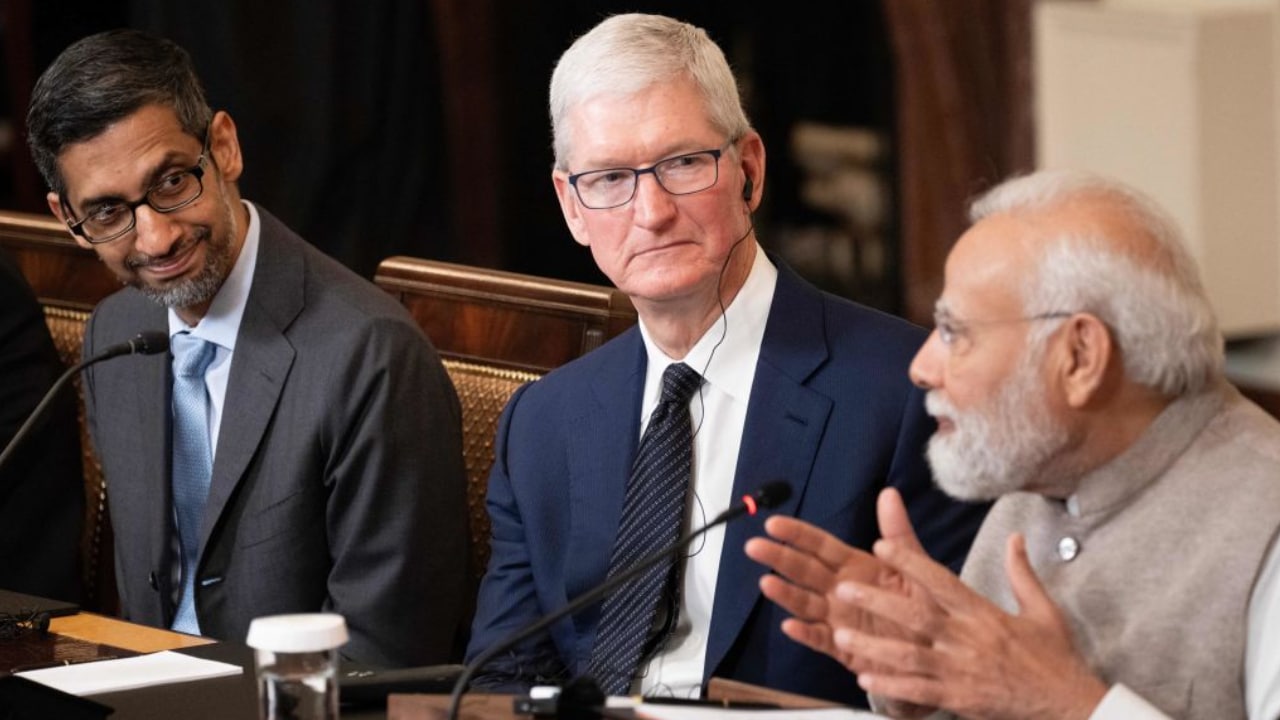 Từ trái sang: CEO Google Sundar Pichai và CEO Apple Tim Cook nghe phát biểu của Thủ tướng Ấn Độ Narendra Modi tại hội nghị thương mại cấp cao Mỹ-Ấn ở Nhà Trắng ngày 23/6/2023. (Ảnh: BRENDAN SMIALOWSKI/AFP qua Getty Images)