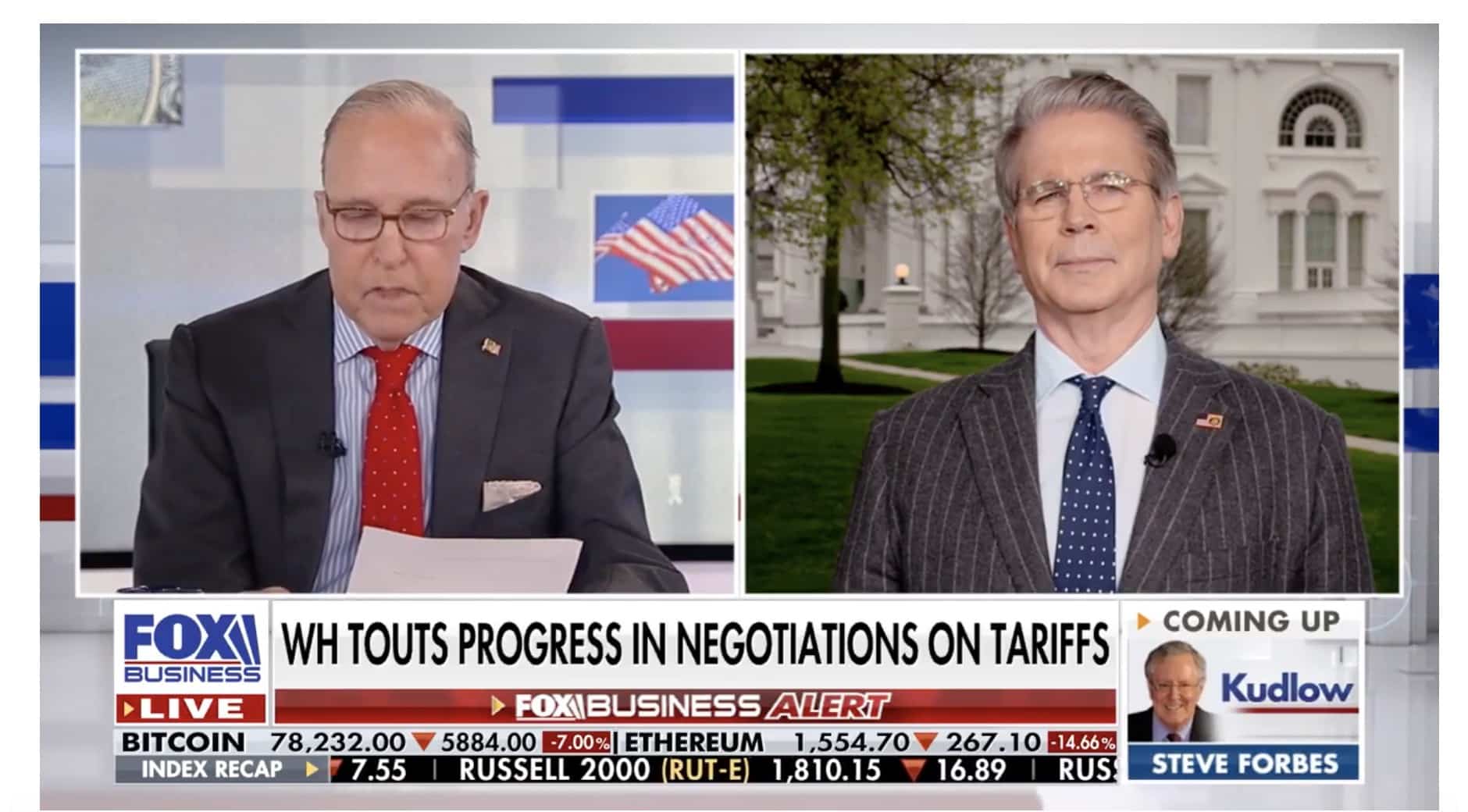 Bộ trưởng Tài chính Hoa Kỳ đáp rằng: “Tôi sẽ nhắc lại những gì tôi thấy vào tuần trước đối với các quốc gia không trả đũa. Chúng tôi đang [bị áp] ở mức thuế quan tối đa và tôi hy vọng rằng thông qua các cuộc đàm phán tốt, tất cả những gì chúng ta sẽ làm là thấy mức thuế giảm xuống. Nhưng điều đó sẽ phụ thuộc vào các quốc gia khác. Và bạn biết đấy, Tổng thống Trump sẽ đích thân tham gia vào các cuộc đàm phán này và giống như nhiều người trong chúng ta, ông ấy tin rằng đã có một sân chơi không công bằng, vì vậy các cuộc đàm phán sẽ rất khó khăn“.
