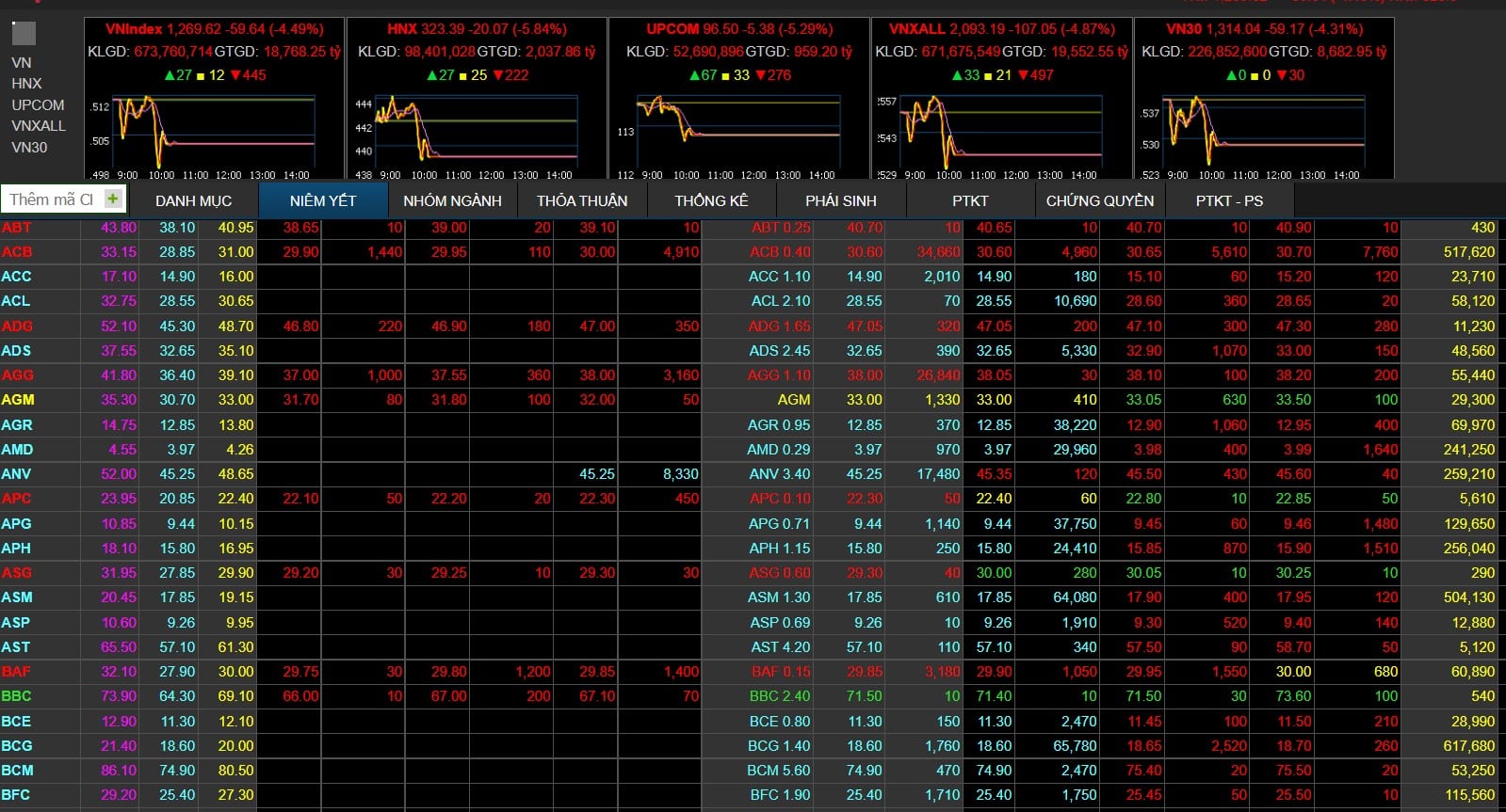 Chỉ số VN-Index mất gần 60 điểm hôm 9/5, thanh khoản toàn thị trường ở mức thấp khiến đà giảm được dự báo chưa dừng. (Ảnh: Bảng giá chứng khoán/mbs.com.vn)