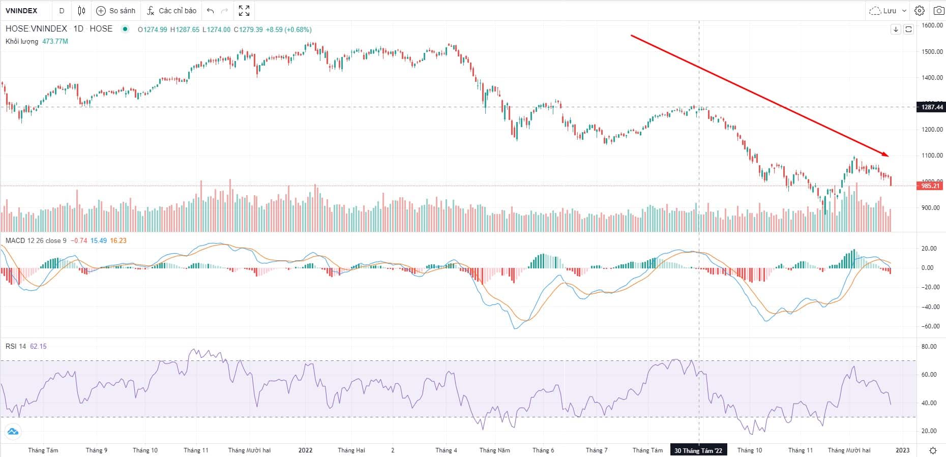 Chỉ số VN-Index phiên giao dịch ngày 26/12 với áp lực bán ra dồn dập đã mất ngưỡng 1.000 điểm, còn 985,2 điểm (giảm 3,4%). Nhiều mã giảm sàn trong rổ chỉ số VN30 như: Novaland (NVL), Bất động sản Phát Đạt (PDR), Tập đoàn Hòa Phát (HPG), v.v… Thanh khoản giao dịch hôm nay đạt 11.000 tỷ đồng.