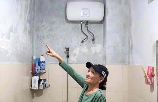 Tường thường xuyên bị thấm ướt từ các căn hộ bên cạnh nên bà Trần Thị Nhung không dám bật nước nóng vì sợ chập điện (Ảnh: baochinhphu.vn)
