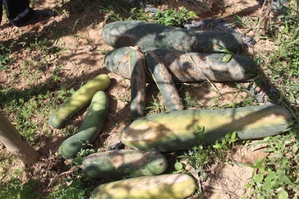 Giá bí đao bị giảm hơn gấp 4 – 5 lần so với những năm trước, không có người thu mua khiến nông dân đành hái về chất đống, hoặc để héo ngoài đồng.
