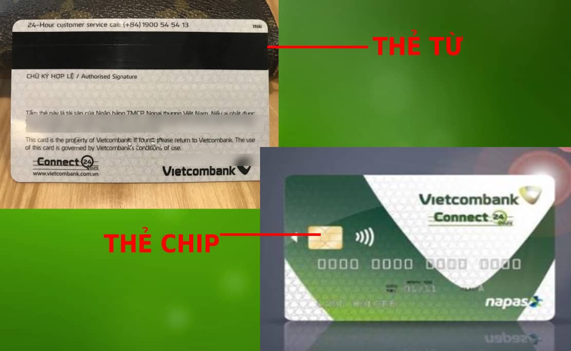 | Cách sử dụng thẻ | Không có quá nhiều sự khác biệt về việc sử dụng của 2 loại thẻ. Tuy nhiên thẻ gắn chip có thể được sử dụng rộng rãi hơn, kèm theo đó là tiện ích khi thanh toán cũng sẽ tích hợp nhiều hơn trên ứng dụng, thanh toán quốc tế cũng dễ dàng hơn dạng thẻ từ. | |