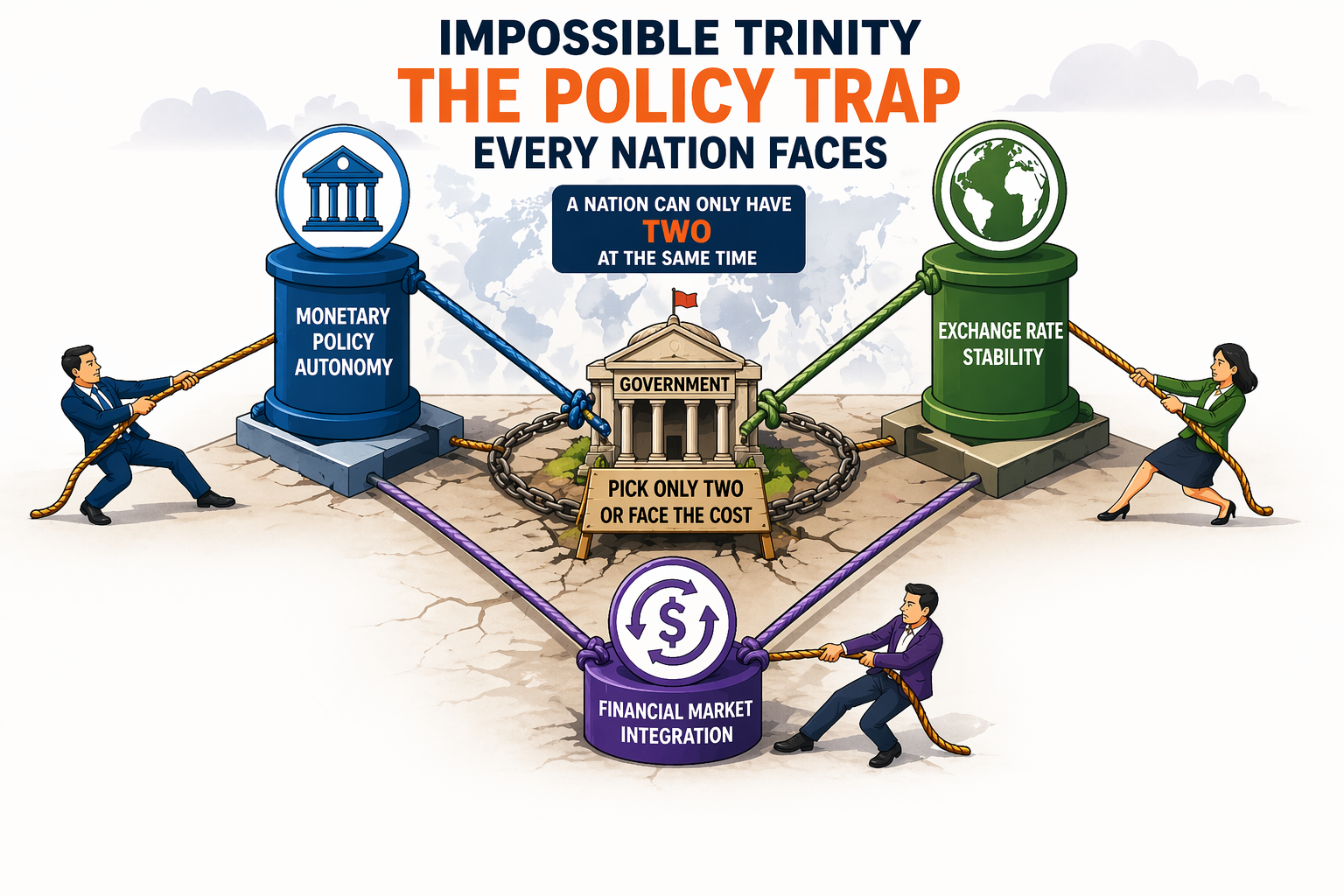 Đứng trước lạm phát vượt trần 4,65% và tỷ giá đối mặt nguy cơ mất giá sâu, NHNN Việt Nam rơi vào bế tắc cùng cực của “Bộ ba bất khả thi” (Mundell-Fleming Trilemma). Theo mô hình này, một quốc gia không thể đồng thời duy trì ba mục tiêu: tỷ giá cố định, tự do lưu chuyển vốn, và chính sách tiền tệ độc lập.