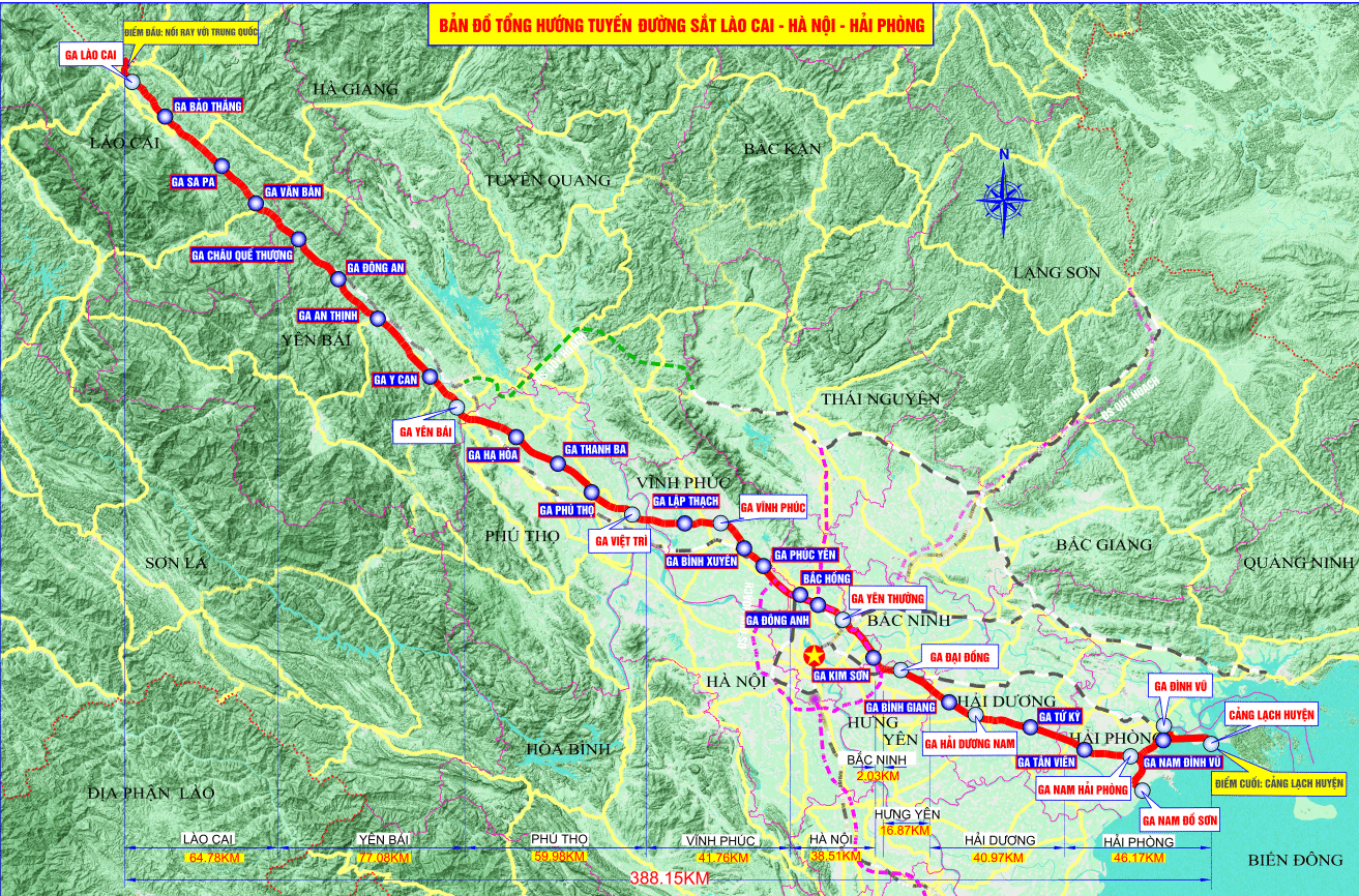 Dự án đầu tư tuyến đường sắt Lào Cai – Hải Phòng – Hà Nội Tháng 2/2025, Quốc hội thông qua nghị quyết về chủ trương đầu tư tuyến đường sắt Lào Cai – Hải Phòng – Hà Nội với tổng vốn 203.231 tỷ đồng, tương đương 8,37 tỷ USD. Điểm đầu dự án tại vị trí nối ray qua biên giới (tỉnh Lào Cai), điểm cuối tại ga Lạch Huyện (Hải Phòng), dài gần 391 km; chiều dài tuyến nhánh 27,9 km, đi qua 9 tỉnh, thành Lào Cai, Yên Bái, Phú Thọ, Vĩnh Phúc, Hà Nội, Bắc Ninh, Hưng Yên, Hải Dương và Hải Phòng. Tuyến đường sắt được đầu tư mới đường đơn, khổ 1,435 m, vận chuyển chung hành khách, hàng hóa; tốc độ thiết kế 160 km/h với tuyến chính từ ga Lào Cai mới đến ga Nam Hải Phòng; tốc độ thiết kế 120 km/h với đoạn qua khu vực đầu mối TP Hà Nội; tốc độ 80 km/h với các đoạn tuyến còn lại; phấn đấu hoàn thành dự án chậm nhất năm 2030. Dự án được áp dụng 18 chính sách đặc thù, đặc biệt để huy động tối đa các nguồn lực, rút ngắn thời gian thực hiện, phân cấp, phân quyền trong tổ chức thực hiện, hỗ trợ phát triển công nghiệp đường sắt, chuyển giao công nghệ và đào tạo nguồn nhân lực. Ngày 14/4/2025, Việt Nam và Trung Quốc ký kết công thư trao đổi về việc hỗ trợ kỹ thuật lập báo cáo nghiên cứu khả thi tuyến đường sắt khổ tiêu chuẩn Lào Cai – Hà Nội – Hải Phòng. |