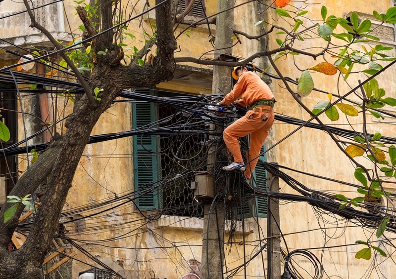 Một kỹ thuật viên đang sửa chữa hoặc kiểm tra mạng điện lộn xộn ở Hà Nội, 2014. (Ảnh: Shutterstock)