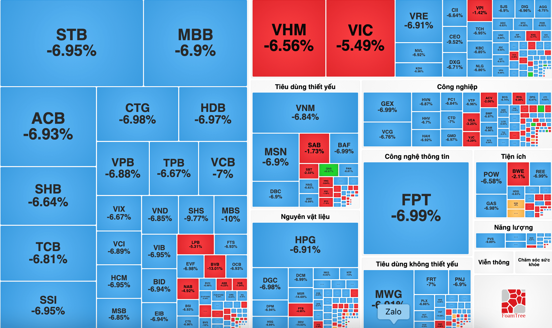 Giảm sâu nhất là cổ phiếu ngành Viễn thông (-7,99%), kế tiếp là Năng lượng (-7,45%), Nguyên vật liệu (-7,25%), Phần mềm (-6,97%), Tín dụng – Ngân hàng (-6,72%), Bảo hiểm (- 6,74%), Phân phối và bán lẻ hàng tiêu dùng (- 6,8%), Bất động sản (-6,2%), Tư liệu sản xuất (- 5,25%), Vận tải (-5,38%), Thực phẩm, đồ uống (-5,51%), Truyền thông giải trí (-5,18%), Bán dẫn (-4,4%), Dược phẩm sinh học (-4,24%), Chăm sóc sức khỏe (-3,69%), Dịch vụ tiêu dùng (-2,49%), Phần cứng có mức giảm thấp nhất (-1,02%).