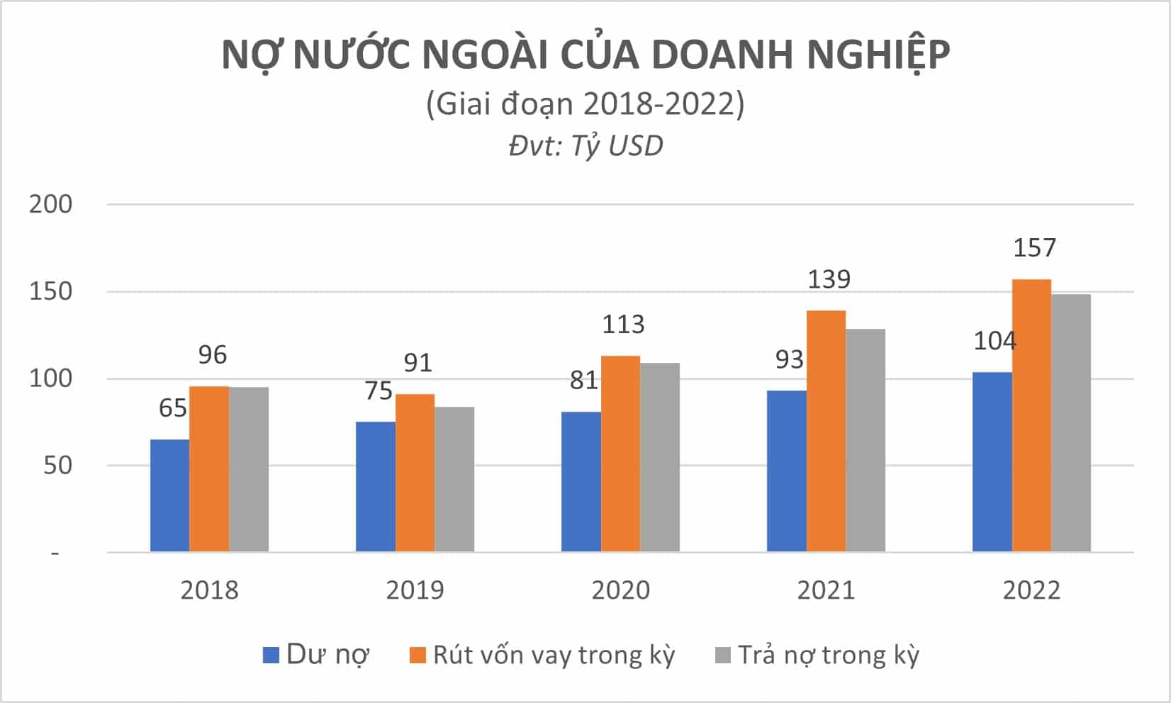 Năm 2022, khối doanh nghiệp đã rút vốn vay nước ngoài 157 tỷ USD, trả nợ nước ngoài 148,6 tỷ USD, trong đó có 146,4 tỷ USD tiền nợ gốc, 2,2 tỷ USD tiền lãi và phí.