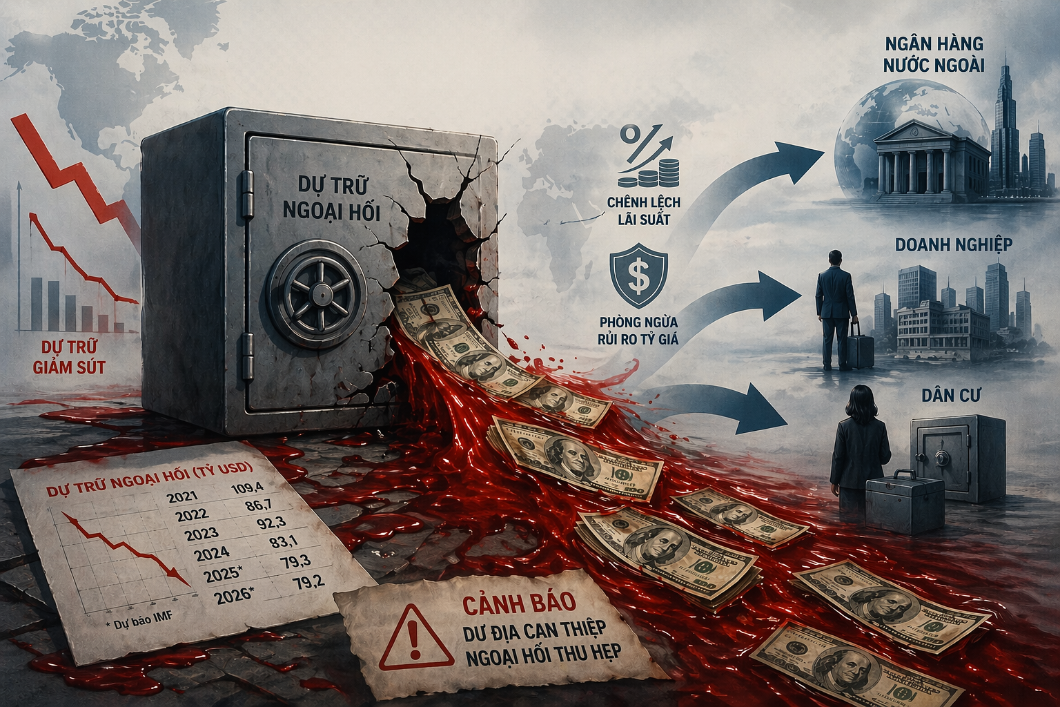 “Các định chế tài chính và doanh nghiệp, vì mục tiêu tối đa hóa lợi nhuận cho cổ đông, buộc phải thực hiện các nghiệp vụ chuyển vốn hợp pháp ra các trung tâm tài chính quốc tế. Quá trình này đã trực tiếp rút cạn thanh khoản ngoại tệ của thị trường liên ngân hàng Việt Nam, biến thặng dư thương mại thành một con số vô nghĩa đối với dự trữ ngoại hối.“