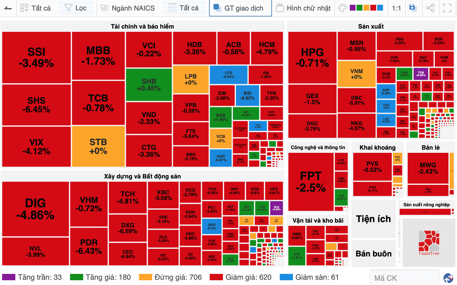Thị trường phân hóa, sắc đỏ chủ đạo thị trường với 620 mã giảm giá, 61 mã giảm sàn, 706 mã đứng giá, 180 mã tăng giá và 33 mã tăng kịch trần.