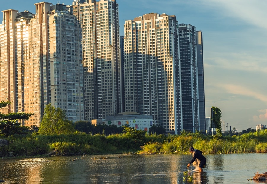 Một người đàn ông thả lưới bắt cá, phía sau là tòa nhà Lanmark 81 ở trung tâm TP và cầu Thủ Thiêm, tháng 7/2020. (Ảnh minh họa: CravenA/Shutterstock)