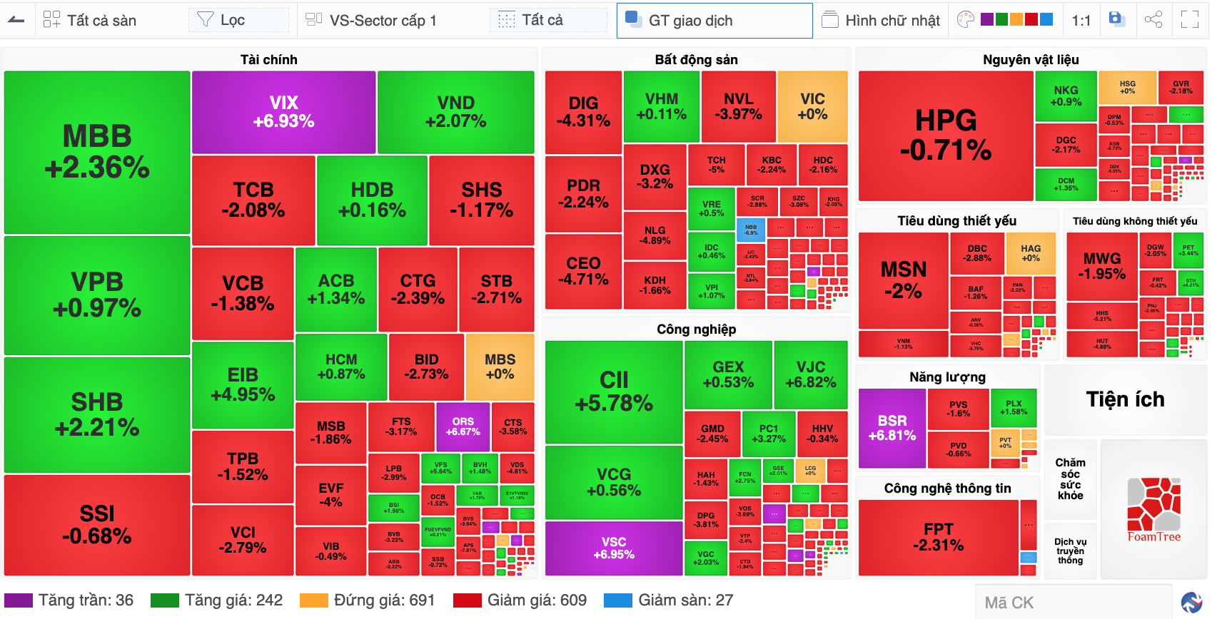 Ở phía ngược lại, nhóm năng lượng ghi nhận mức tăng nổi bật 2,68%, nhưng chỉ nhờ vào đóng góp của hai mã vốn hóa lớn nhất ngành là BSR tăng trần và PLX tăng 1,58%. Bên cạnh đó, nhóm công nghiệp cũng có nhiều điểm sáng đáng chú ý như CII (+5,78%), VGC (+2,03%), FCN (+2,75%), PC1 (+3,27%), VJC (+6,82%) cùng VSC và IPA tăng trần.