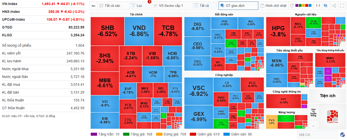 Chiều bán áp đảo hoàn toàn khiến thị trường chìm trong sắc đỏ, sàn với hơn 670 mã giảm điểm. VN-Index đóng cửa giảm 64 điểm (-4,11%) qua đó lùi về gần mốc 1.490 điểm.