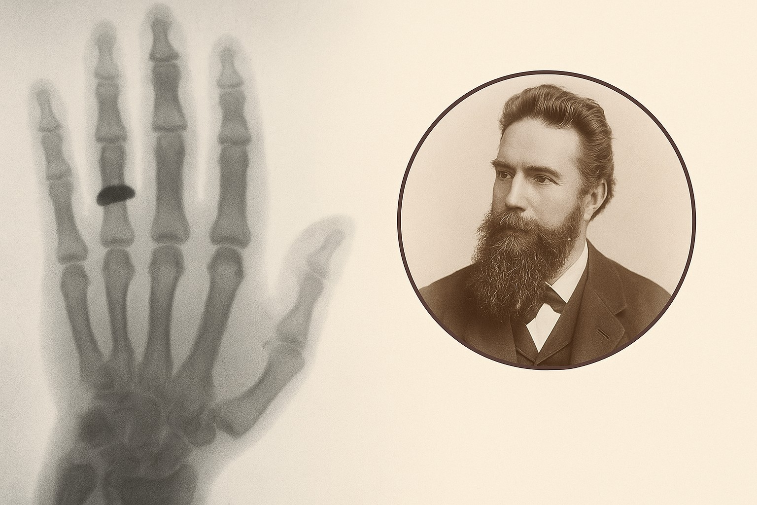 Khi Röntgen đang nghiên cứu các ống tia cathode (Crookes tube), ông nhận thấy màn huỳnh quang gần đó phát sáng dù được che kín. Nhận ra đây là một hiện tượng lạ, ông tiến hành hàng loạt thí nghiệm, và ngày 22/12/1895, ông tạo ra bức ảnh X-quang đầu tiên – bàn tay của vợ ông, Bertha Röntgen, trong đó chiếc nhẫn cưới hiện lên rõ nét quanh các đốt xương.