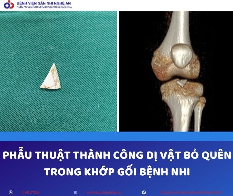 Sau khi nhập viện và hội chẩn, bệnh nhân được bác sĩ tại Bệnh viện Sản Nhi Nghệ An chỉ định phẫu thuật lấy bỏ dị vật. Qua đó, ê kíp bác sĩ lấy ra một mảnh sành hình tam giác sắc nhọn, cạnh dài khoảng 1cm từ trong gối của bé.