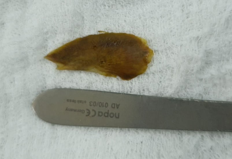Ngày 4/1, bênh nhân được phẫu thuật nội soi ổ bụng. Các bác sĩ phát hiện có một lỗ thủng ruột non ở cách góc hồi manh tràng 20mm. Mở tổn thương kiểm tra, bác sĩ thấy một dị vật giống nắp mang cá đâm thủng thành ruột từ trong ra ngoài, xung quanh lỗ thủng được bao phủ nhiều giả mạc và dịch đục. Ê kíp phẫu thuật đã lấy mảnh xương ra và khâu lại lỗ thủng ruột, rửa sạch bụng và đặt dẫn lưu vùng mổ.