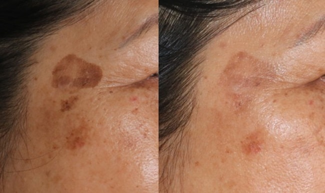 Một phụ nữ ở Tiền Giang mua thuốc trị sạm, nám không rõ nguồn gốc ở chợ với giá 200.000 đồng. Thuốc chứa axit khiến vùng da hai bên gò má bị thương tổn nặng, nhiễm trùng kéo dài.