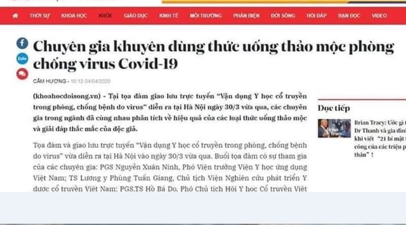 Lược lại thông tin trước đó, ngày 30/3/2020, một buổi tọa đàm giao lưu trực tuyến “Vận dụng Y học cổ truyền trong phòng, chống bệnh do virus” được tổ chức tại Hà Nội, với nội dung các chuyên gia khuyên dùng thảo mộc dân gian để tăng cường hệ miễn dịch cho cơ thể, để phòng bệnh COVID-19 và các biến chứng phổi của người từng nhiễm COVID-19. Trong buổi tọa đàm, phần trả lời có đưa thông tin “không nên tự mua 9 loại riêng lẻ từ các nơi khác nhau mà không có kiểm soát về nguồn gốc và chất lượng, quy trình sắc thuốc không đảm bảo, làm giảm chất lượng của bài thuốc. Chúng tôi khuyên nên mua trà thảo mộc Dr.Thanh đã được kiểm định chất lượng từng khâu chặt chẽ quy trình chiết xuất hiện đại, mang lại hiệu quả mong muốn”.