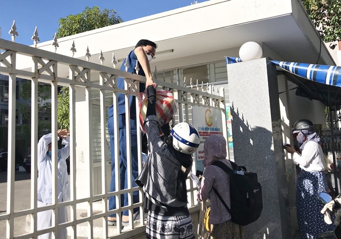 Bệnh viên C Đà Nẵng phong tỏa từ sáng 24/7. Hàng trăm người đến tiếp tế, đưa thức ăn, đồ dùng cho bệnh nhân trong bệnh viện. (Ảnh: P.T)