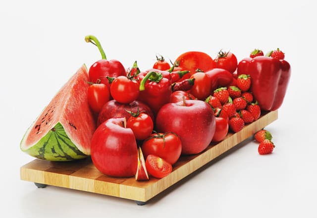Theo học thuyết về Ngũ hành của Đông y, màu đỏ là lửa, đi vào tim, bổ khí huyết. Từ góc nhìn Tây y, các loại rau quả màu đỏ giàu các chất chống oxy hóa như lycopene và anthocyanins. Những chất này có khả năng chống oxy hóa cao và có thể làm giảm nguy cơ mắc bệnh tim mạch.