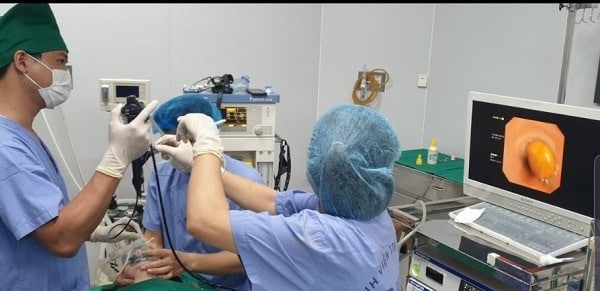 Sau khi chụp CT Scanner ngực tìm dị vật, làm các xét nghiệm máu và có kết quả về vị trí dị vật, các bác sĩ tiến hành nội soi phế quản gắp dị vật ra ngoài.