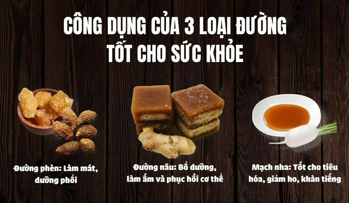 Ví dụ, đường nâu còn giữ được nhiều khoáng chất nên được đánh giá là bổ dưỡng. Đường phèn là đường trắng kết tinh lại, có vị nhẹ, tính ôn hòa. Còn mạch nha, làm từ ngũ cốc lên men, được biết đến với công dụng làm dịu và dưỡng phổi. Trái lại, các loại đường tinh luyện hiện đại như siro ngô chứa fructose cao có quy trình sản xuất phức tạp và nên hạn chế sử dụng.