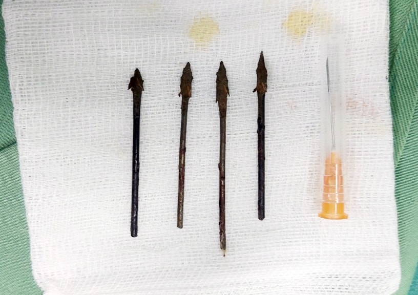 Ca phẫu thuật được tiến hành bởi 3 chuyên khoa Tai Mũi Họng, Mắt và Gây mê hồi sức. Sau hơn 1 giờ phẫu thuật, 4 đầu mũi tên dài 5cm đã được các bác sĩ đưa ra khỏi vùng mặt bệnh nhân.