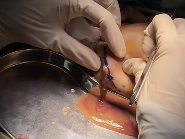 Hình ảnh dịch mủ chứa chất làm đầy từ sau tiêm filler má. (Ảnh: Bệnh viện Trung ương Quân đội 108)