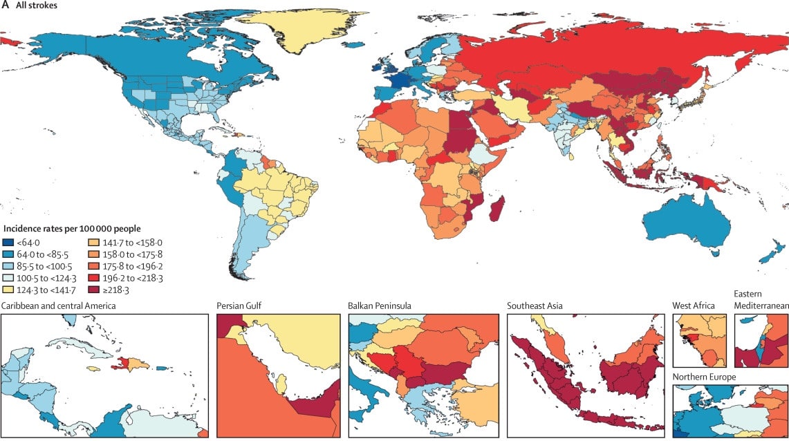 Thuộc vùng đỏ đậm nhất trên bản đồ đột quỵ thế giới, Việt Nam nằm trong nhóm những quốc gia có nguy cơ đột quỵ cao nhất thế giới, tỷ lệ đột quỵ ước tính vượt 218/100.000 dân.