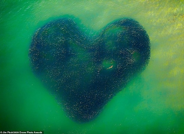 Bức ảnh gây kinh ngạc: Đàn cá hồi xếp thành hình trái tim bao vây cá mập
